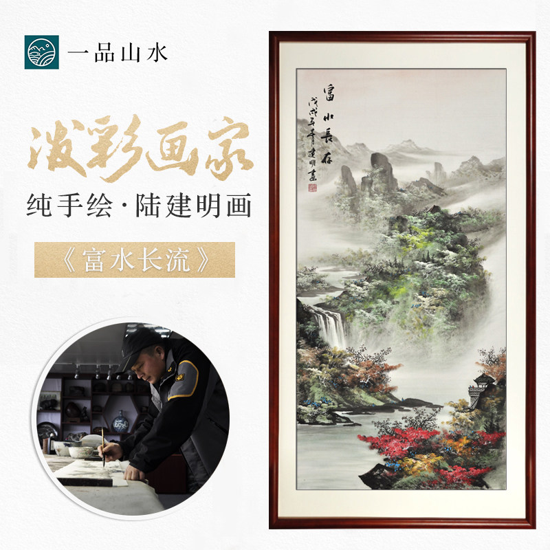 纯手绘山水画竖幅字画挂画国画客厅玄关过道聚财鸿运当头富水长流