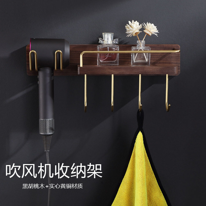 胡桃木吹风机置物架壁挂免打孔中古风筒支架洗脸巾一体吹风机架子