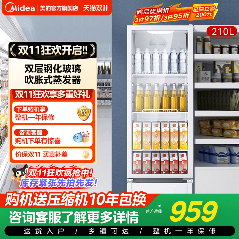 美的208/318饮料展示柜冷藏冰柜保鲜柜商用立式冷柜直冷冰箱官方