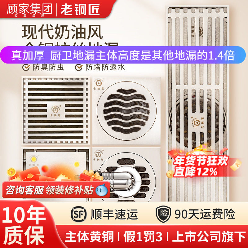 顾家老铜匠全铜防臭地漏防堵枪灰卫生间地漏衣机下水淋浴地漏三通