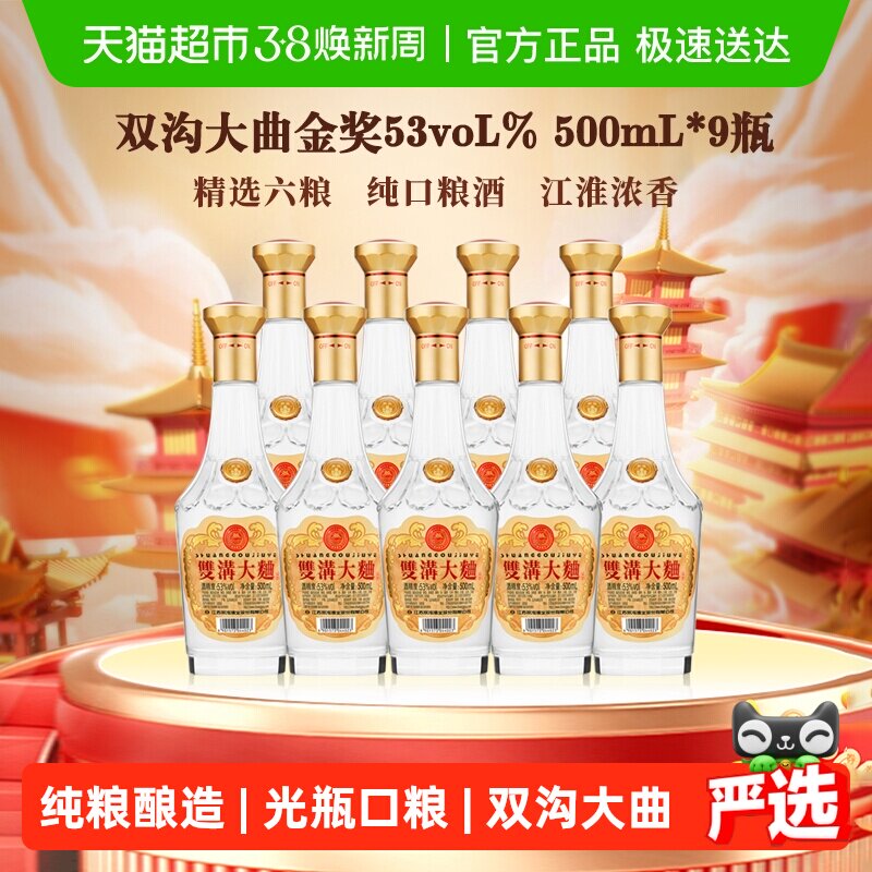 双沟大曲金奖53度500mlx9整箱装浓香型白酒复古光瓶装纯粮食酒