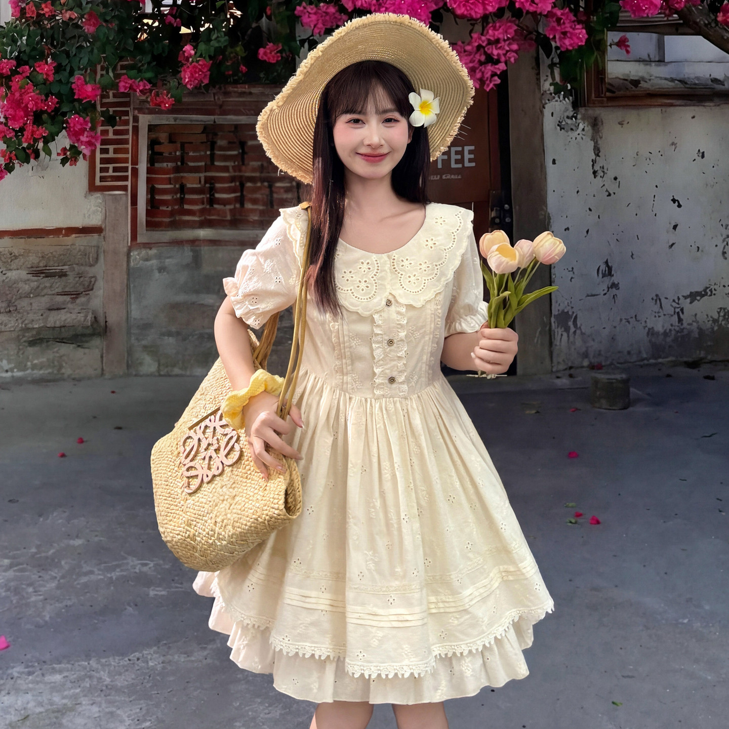 贰羊设计【槿上花语】100棉复古风方领镂空绣花连衣裙女夏a字长裙