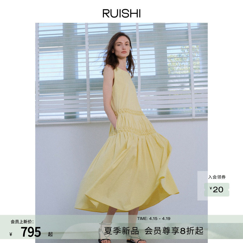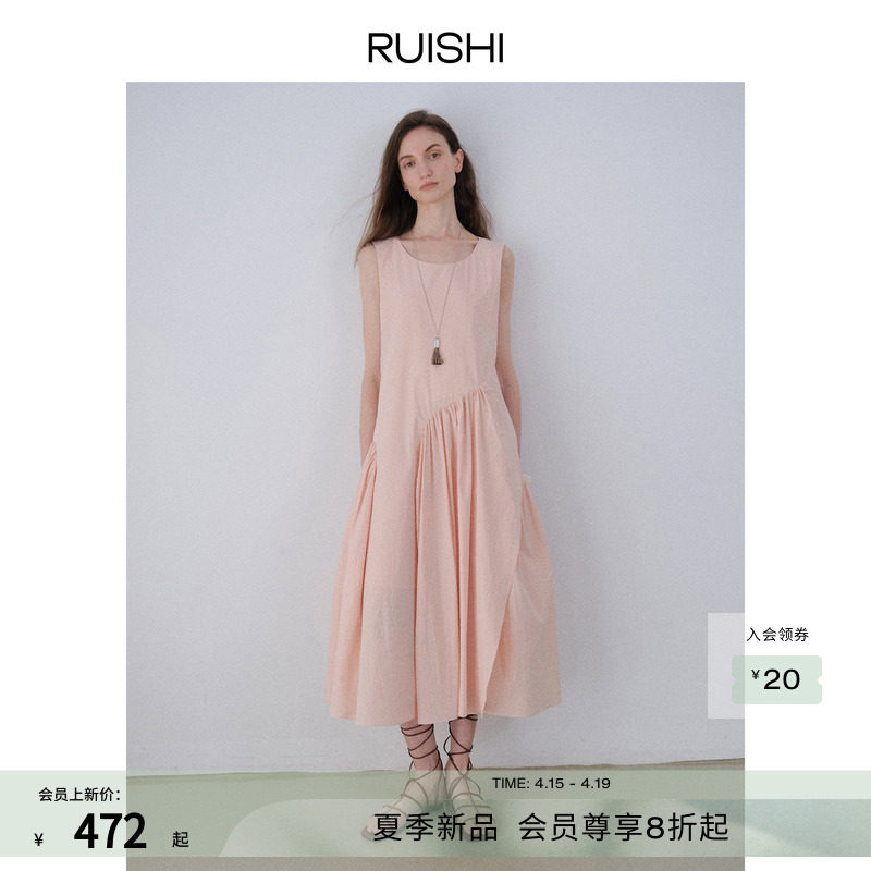 RUISHI芮时“浮光曳影”100棉圆领无袖不规则长款A字连衣裙女夏