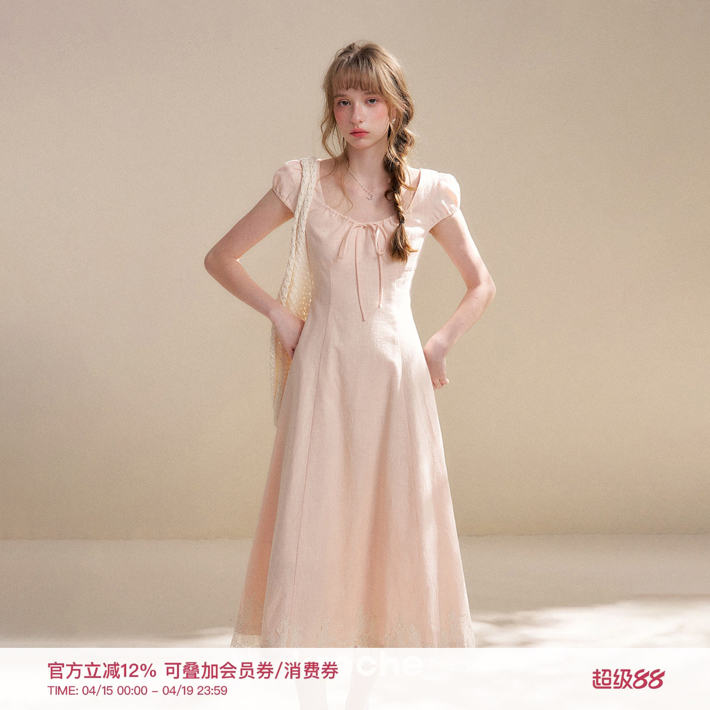 Kroche 26ss 定染苎麻棉 法式蕾丝花边拼接收腰A字短袖度假连衣裙