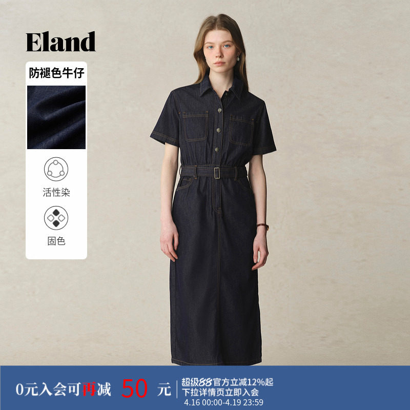 【防褪色牛仔】Eland衣恋牛仔连衣裙女衬衫领A字纯棉薄款长裙夏季