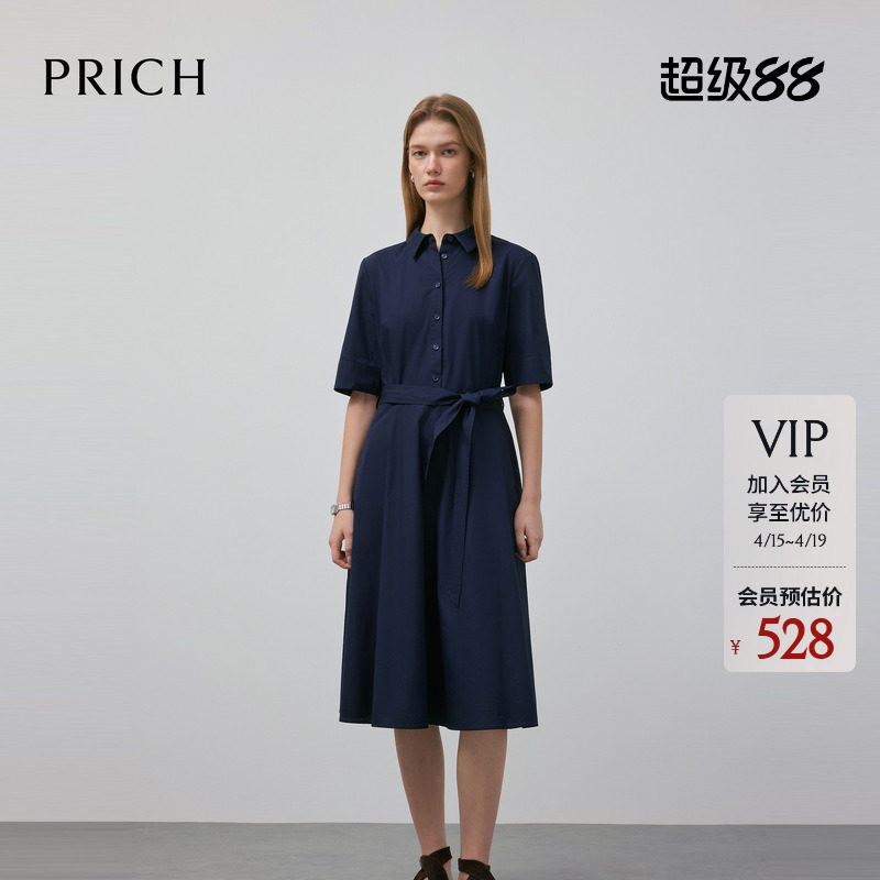 【100%棉】PRICH时尚复古衬衫式短袖连衣裙春收腰A字裙女