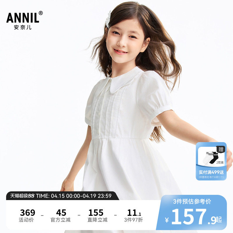 安奈儿童装女童翻领短袖连衣裙2026夏新款小清新纯棉A字中长裙子