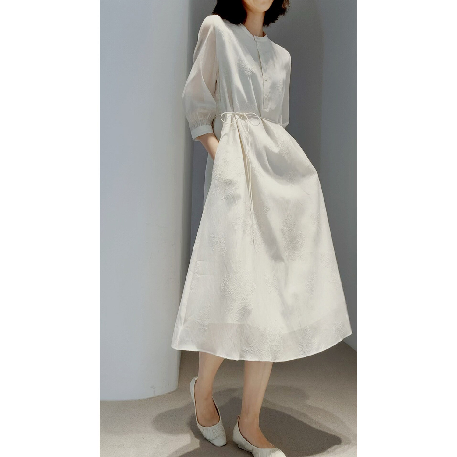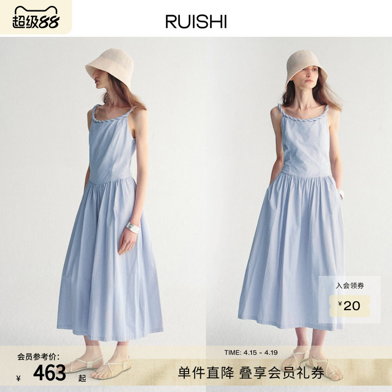 RUISHI芮时“浅夏星褶”棉锦混纺重工捏褶肌理圆领A字连衣裙女夏