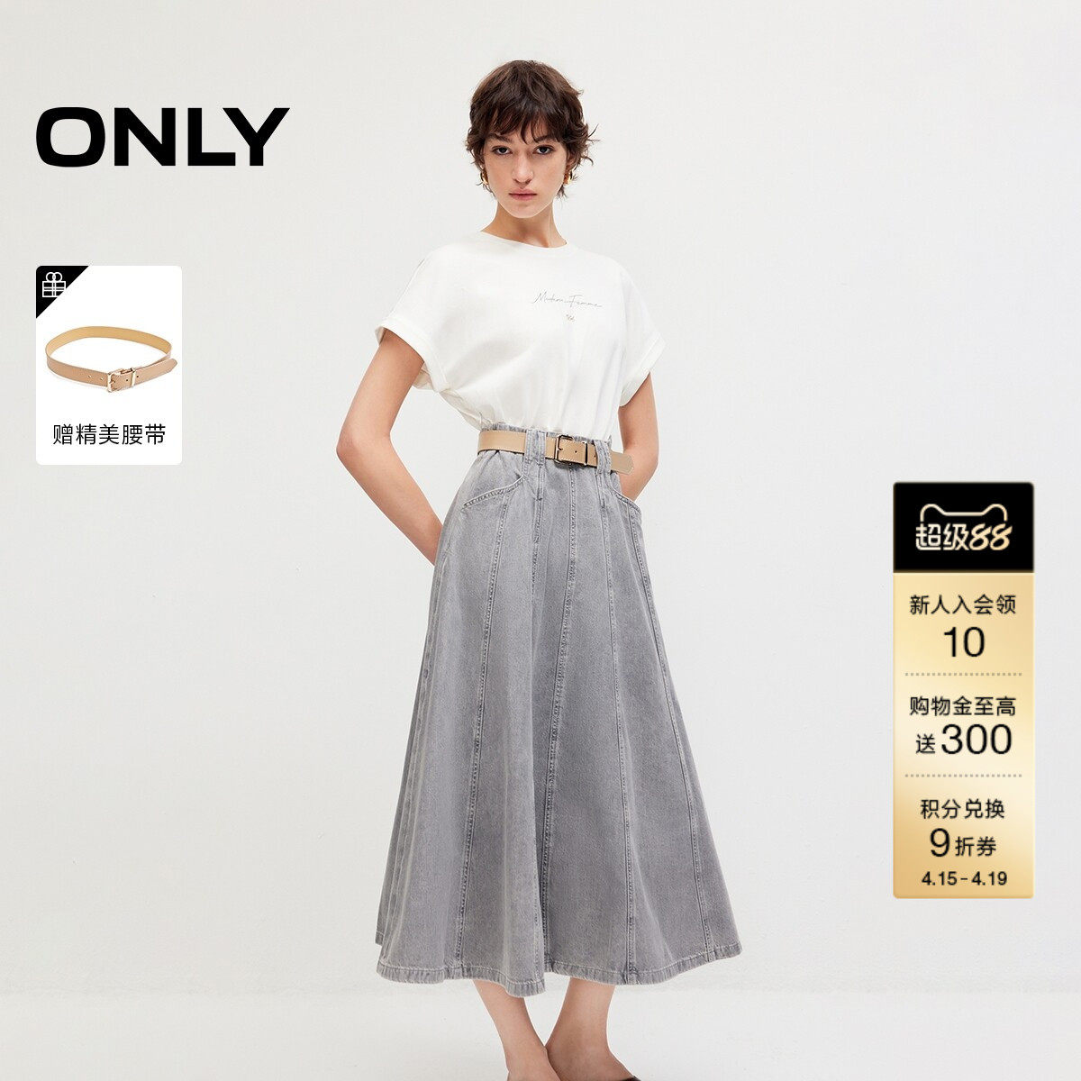ONLY2026春季新款落肩收腰裙子A字牛仔拼接休闲中长款纯棉连衣裙