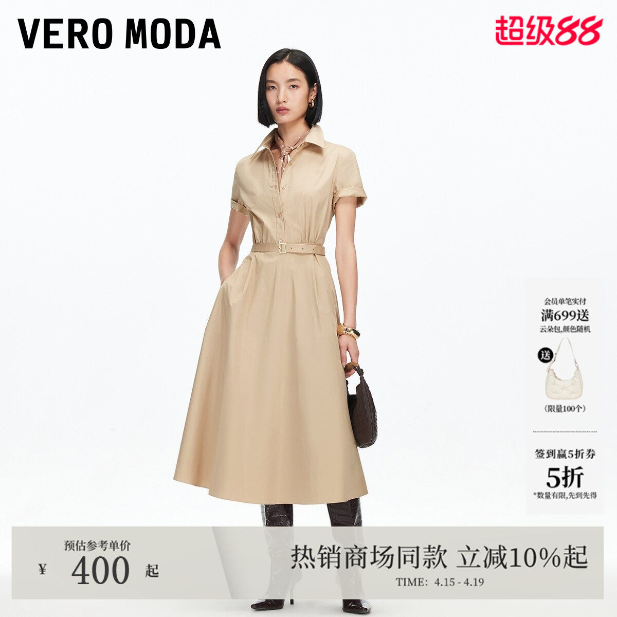 Vero Moda连衣裙2026夏季新款腰带翻领灯笼袖纯棉A字裙32627B006