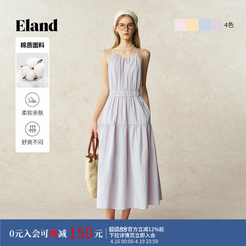 【元气裙】Eland衣恋连衣裙女纯色挂脖领系带棉质a字裙夏季