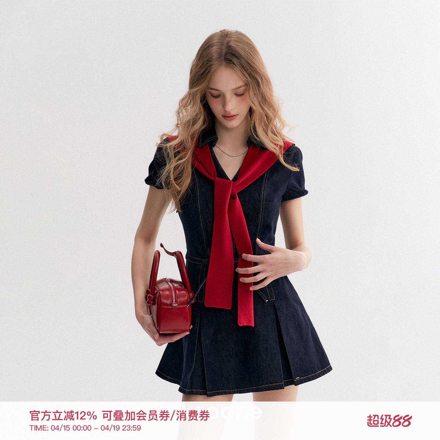 Kroche 慵懒法式 Polo小V领 棉质牛仔系带收腰压褶A字连衣裙