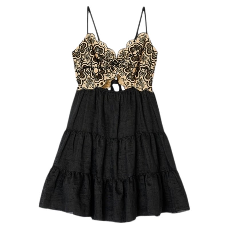 SANDRO春夏女装法式优雅棉质杏色花朵刺绣镂空A字短款吊带连衣裙