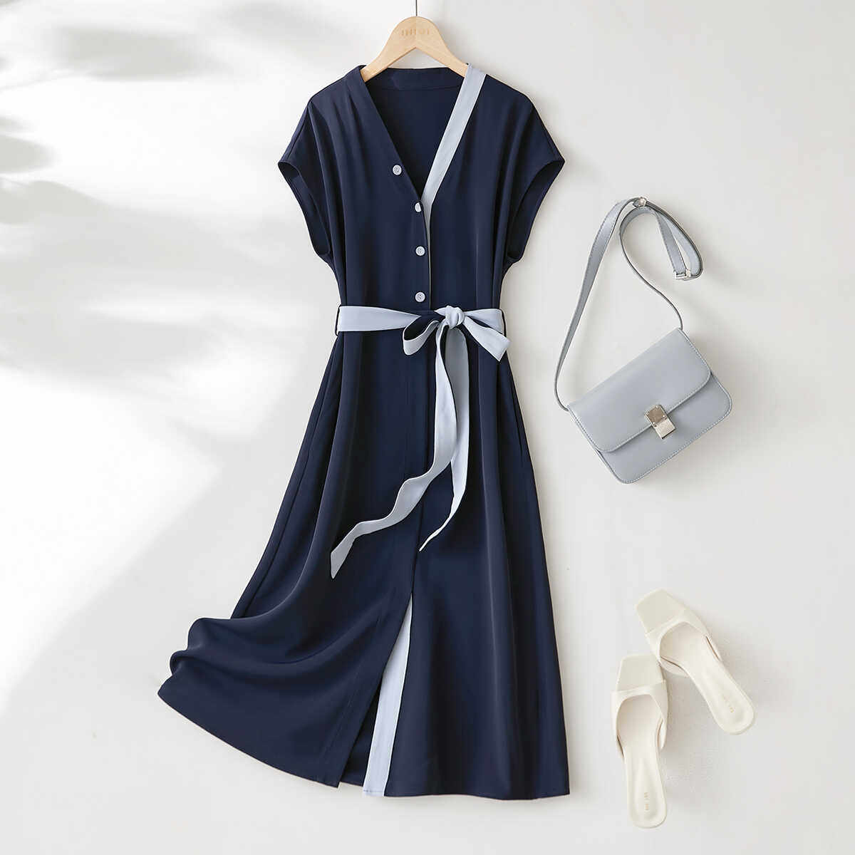 贰羊设计【三遥寻】100棉V领连衣裙女夏季收腰修身小飞袖a字短裙
