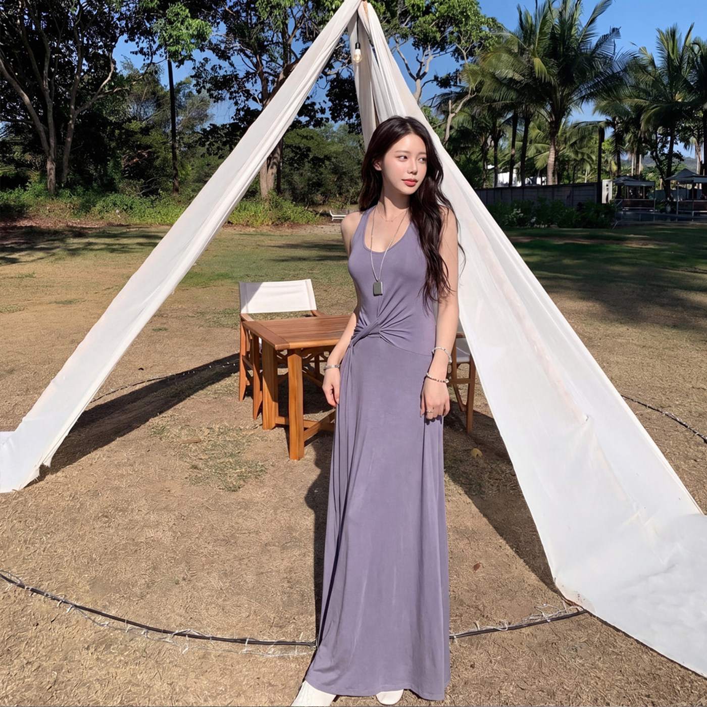 alex stevens度假风挂脖无袖吊带连衣裙女夏季修身扭结A字长裙子