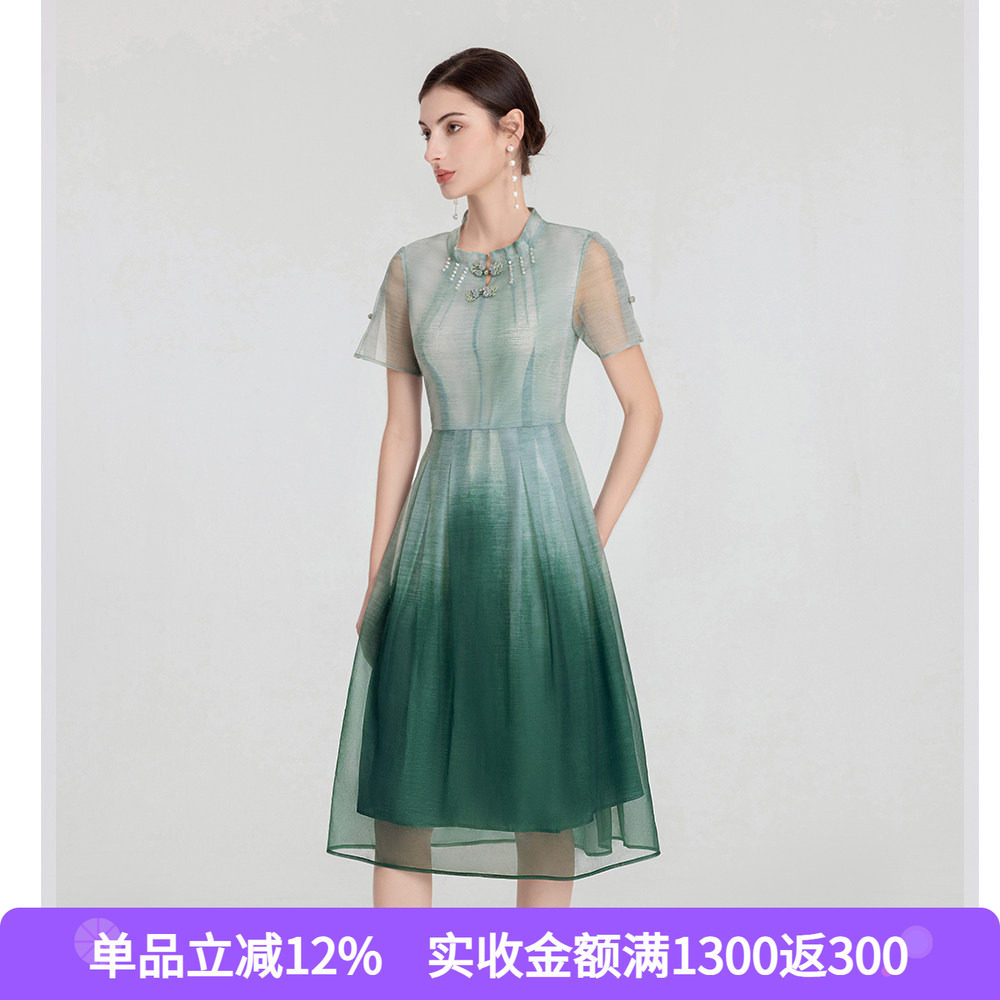 司歌 独特别致国风渐变短袖连衣裙女2026夏季新款新中式修身A字裙