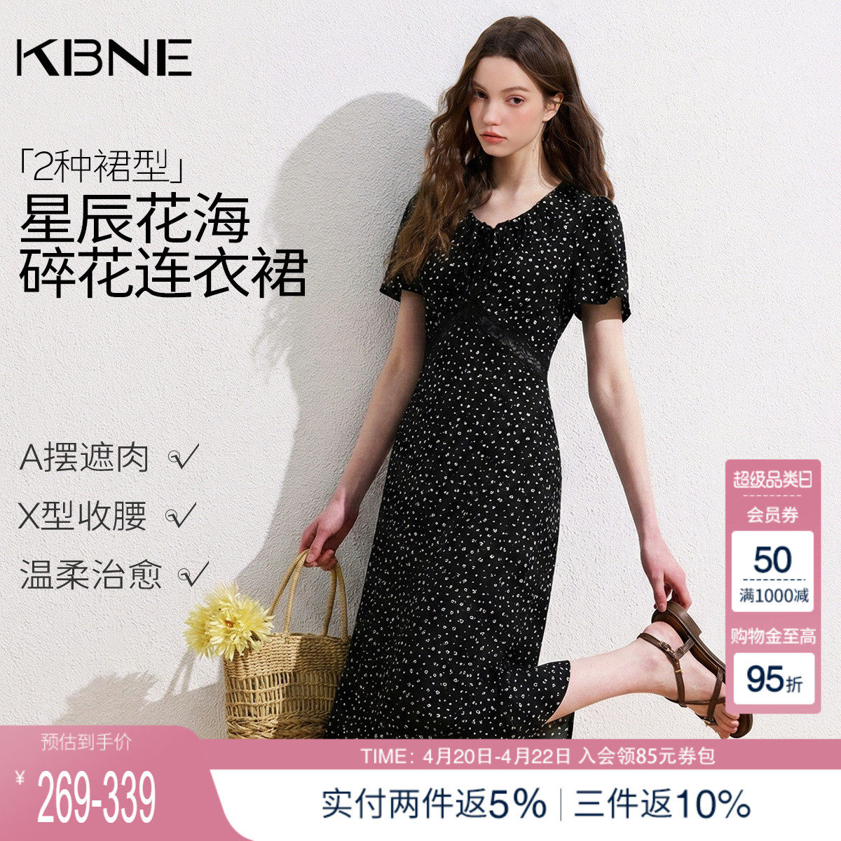 KBNE法式v领蕾丝拼接碎花连衣裙女2026夏季新款a字显瘦修身收腰裙