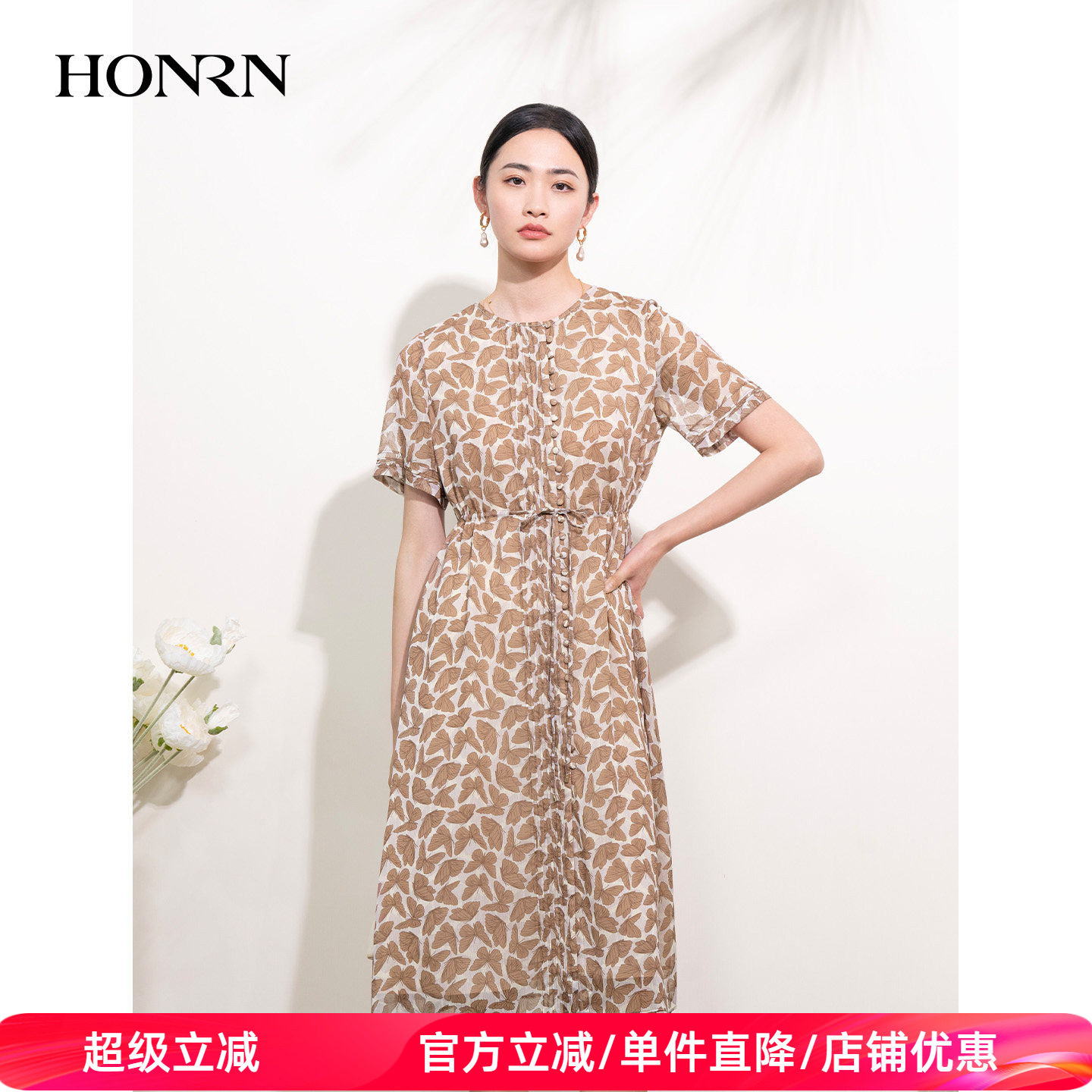 HONRN/红人修身印花圆领抽绳收腰显瘦短袖a字连衣裙女夏HI22OL691