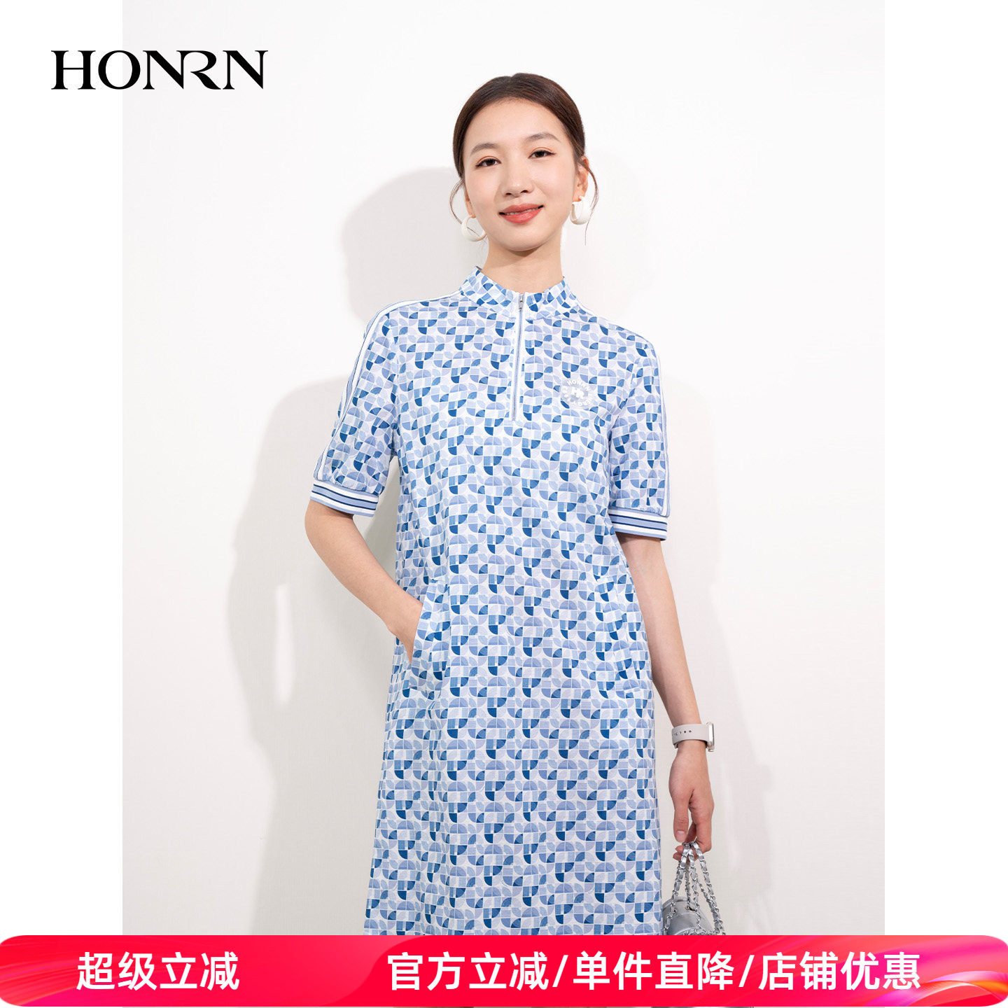 HONRN/红人休闲小众设计感印花修身显瘦a字连衣裙女夏季HH22OL767