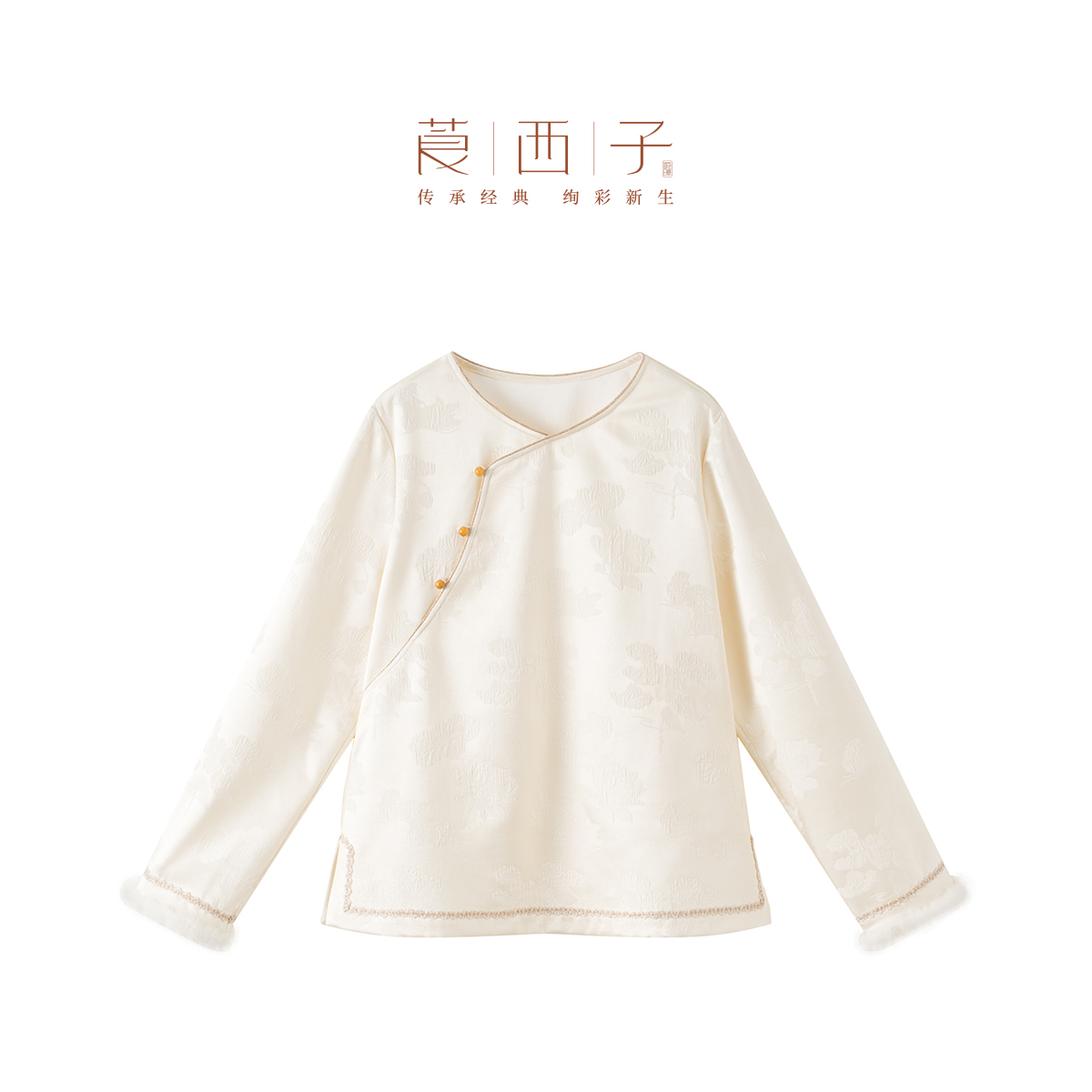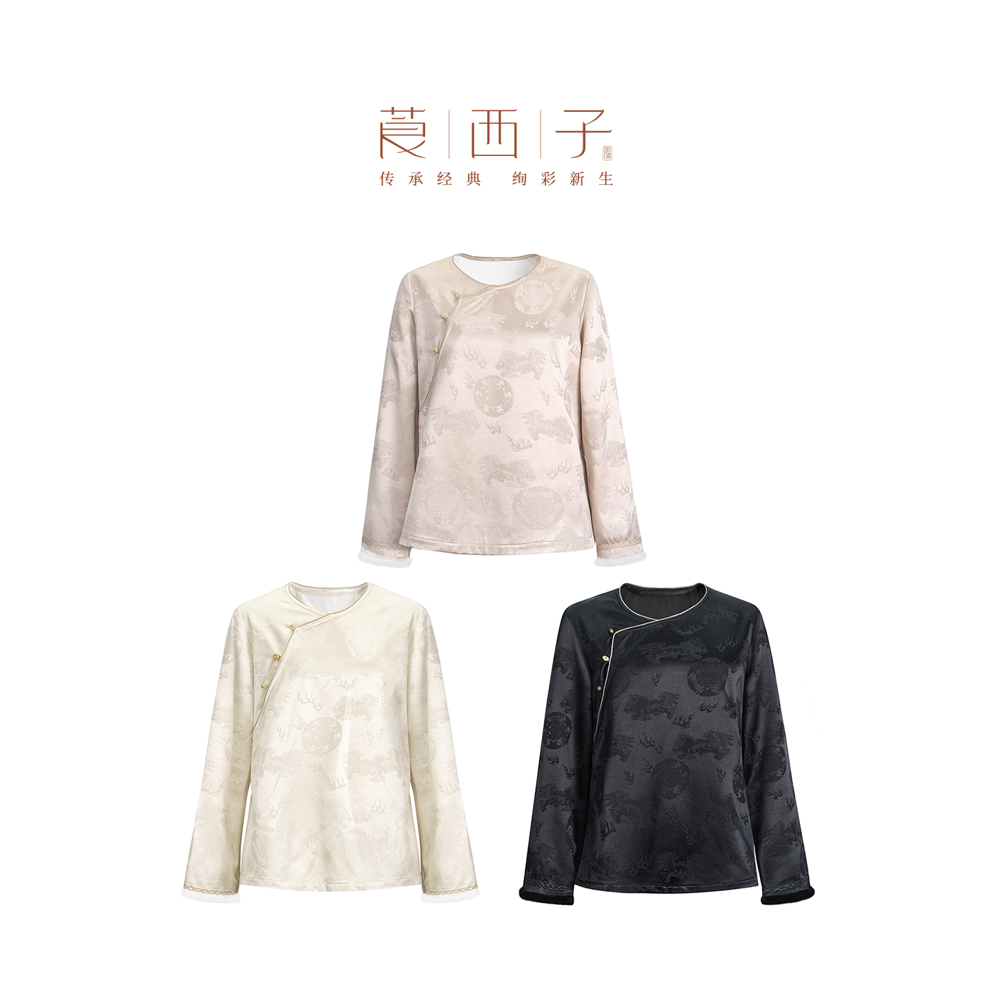 国风新中式醋酸真丝长袖衬衣女圆领复古提花上衣桑蚕丝缎面打底衫