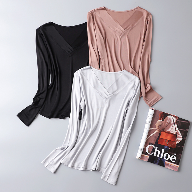秋冬重磅针织真丝长袖纯色内搭外穿打底衫 桑蚕丝V领套头保暖上衣