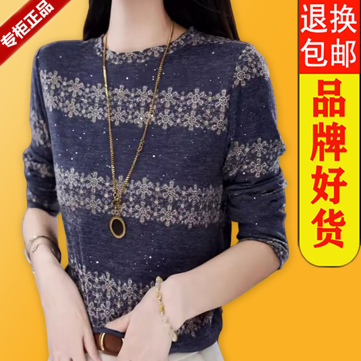 齐黛重磅真丝长袖T恤上衣女大码弹力缎面印花桑蚕丝高端时尚中年