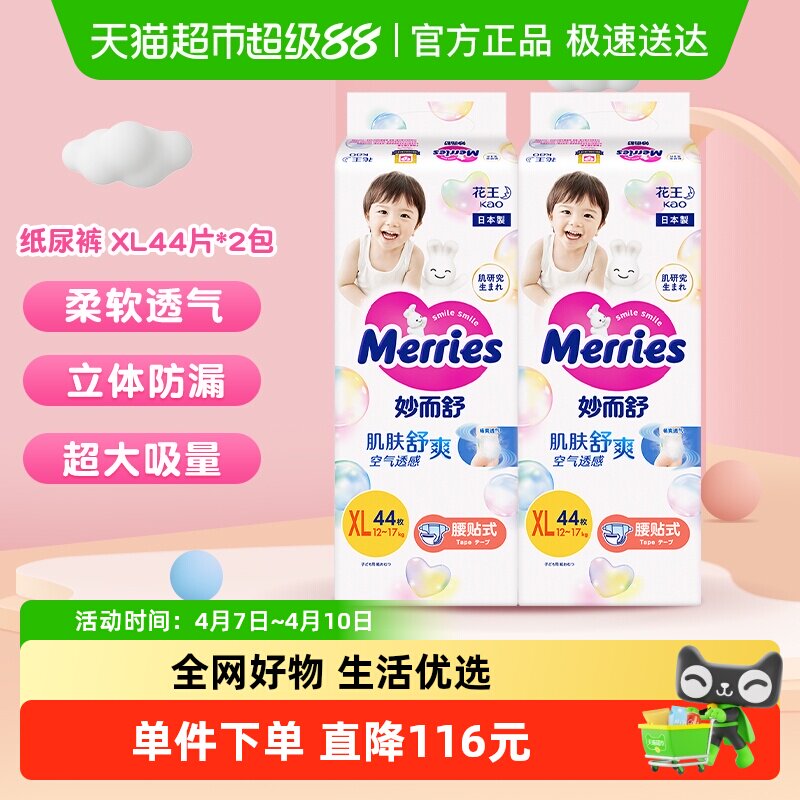 日本进口花王妙而舒纸尿裤XL44片*2包超薄透气新生婴儿尿片尿不湿