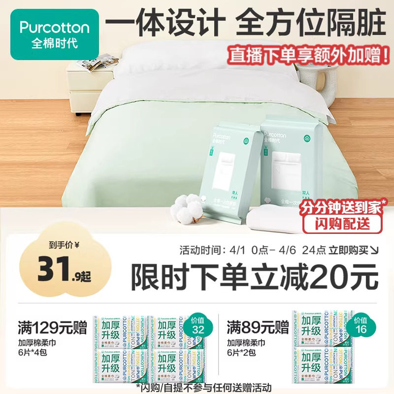 全棉时代一次性床单被罩枕套纯棉火车卧铺酒店旅行睡袋床品四件套