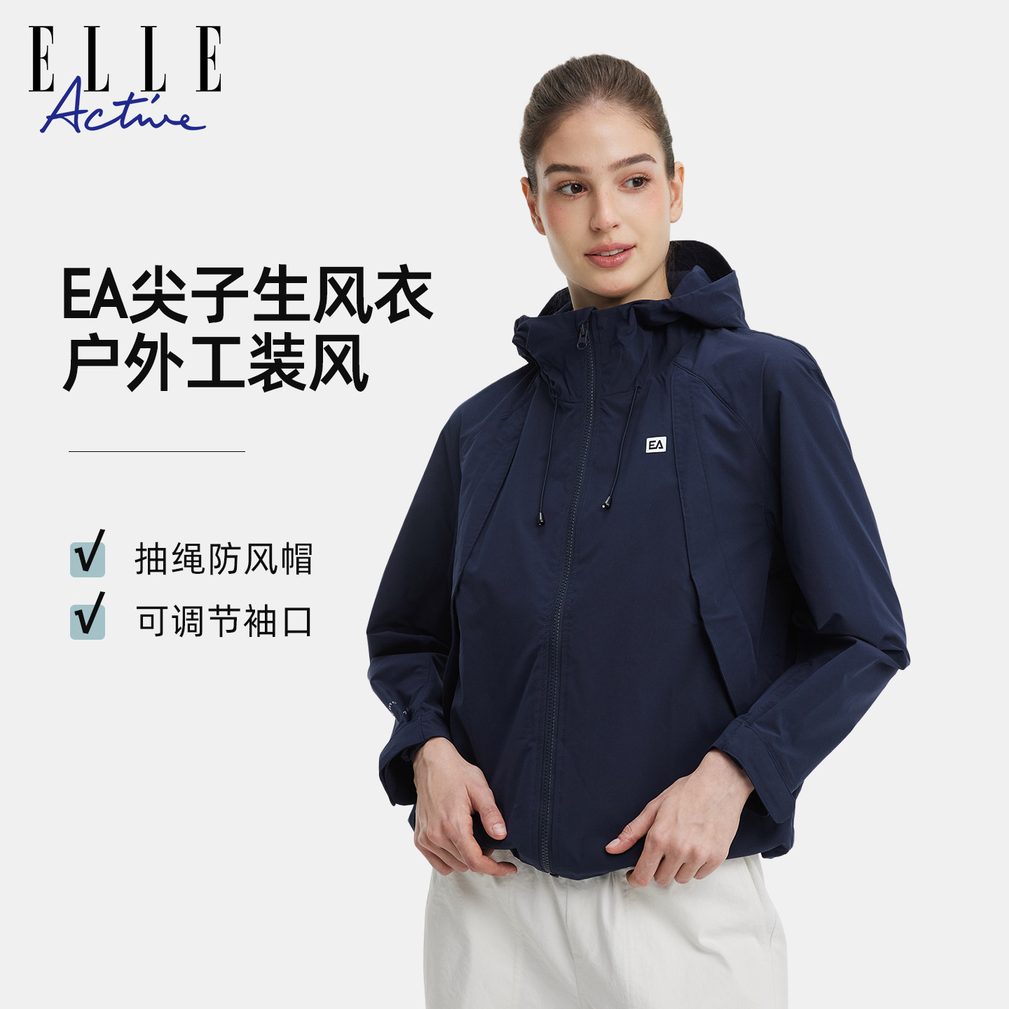 ELLE Active休闲运动风工装连帽短款风衣透气梭织外套女宽松时尚