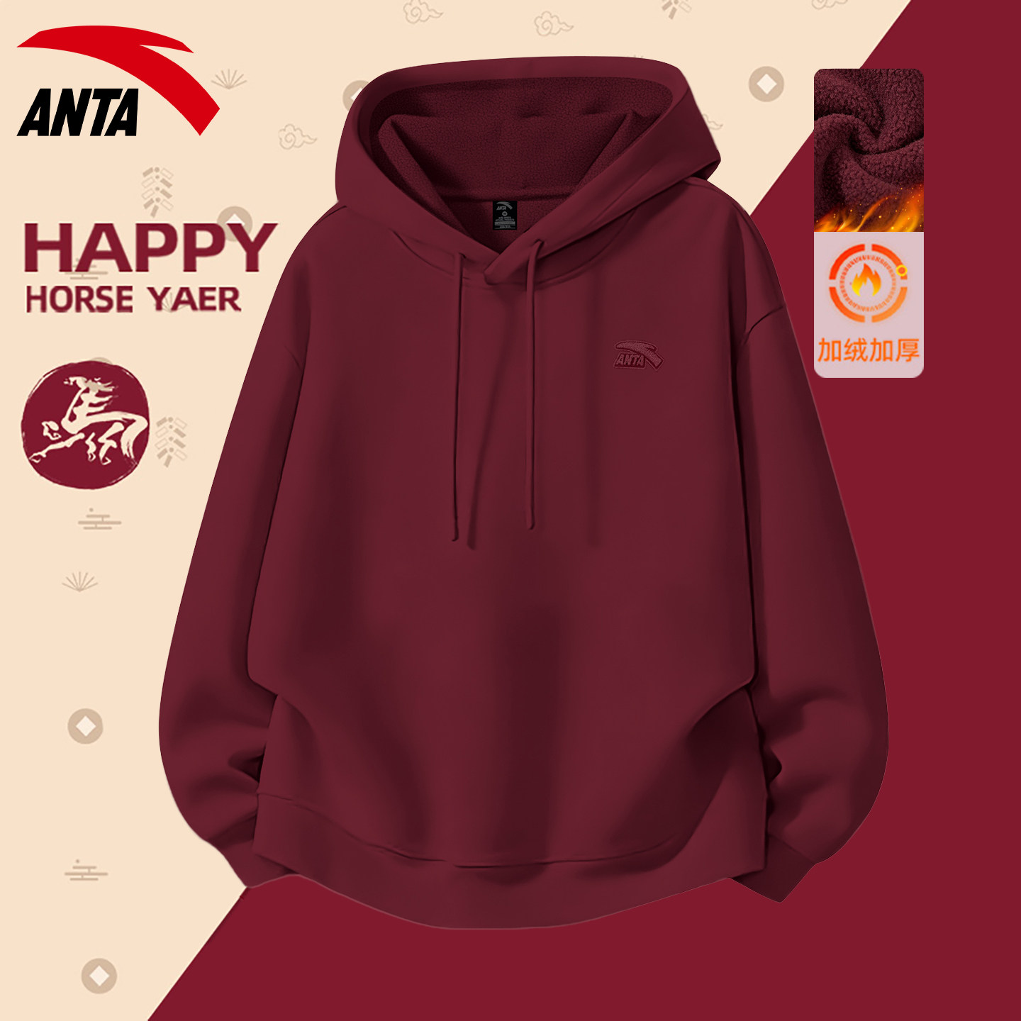 安踏新年连帽卫衣男女同款红色帽衫加绒复古本命年简约百搭运动服