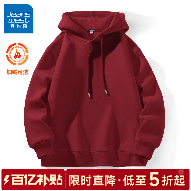 GV真维斯酒红色卫衣男款冬季本命年男士马年连帽加绒加厚红衣服A