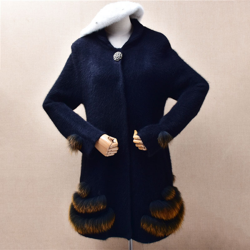 黑色水貂绒毛衣开衫中长款女2023秋冬新款慵懒风宽松v领针织外套