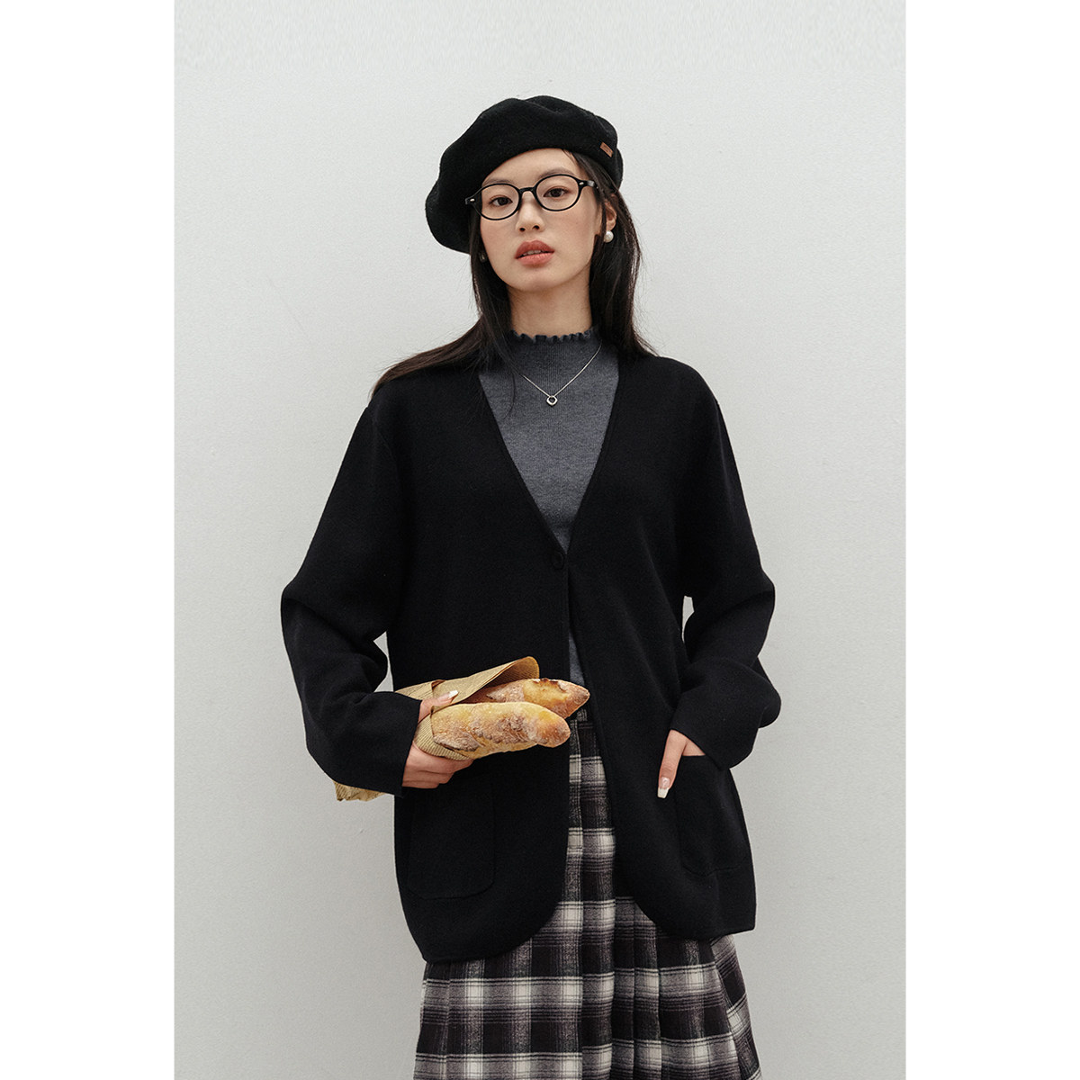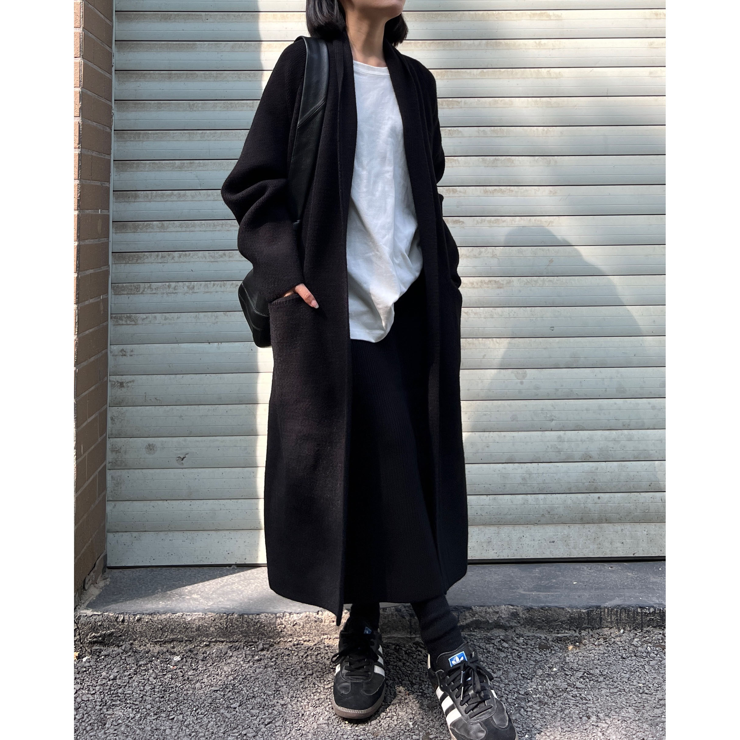 1222-15简约成熟风黑色含羊毛针织开衫女中长款宽松毛衣外套
