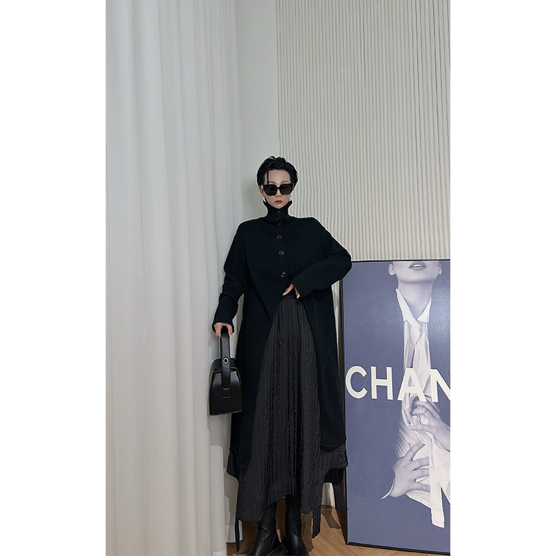 Dan Dan 黑色立领中长款毛衣女 中长款开叉极简风针织外套