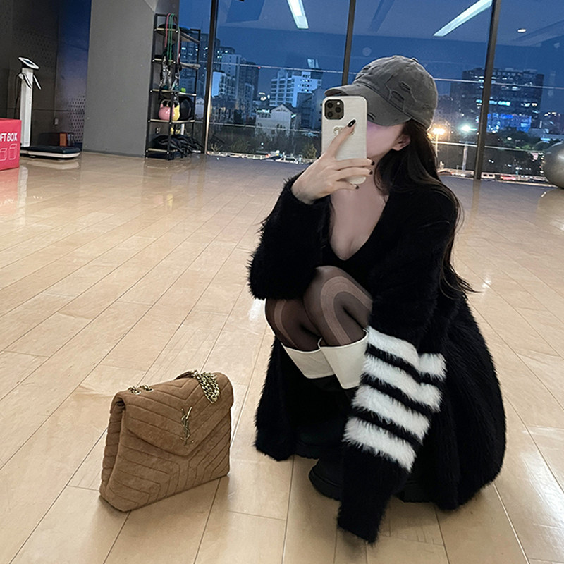 冬季中长款ins长毛貂绒粗砂条纹黑色v领韩版宽松蝙蝠外套毛衣512