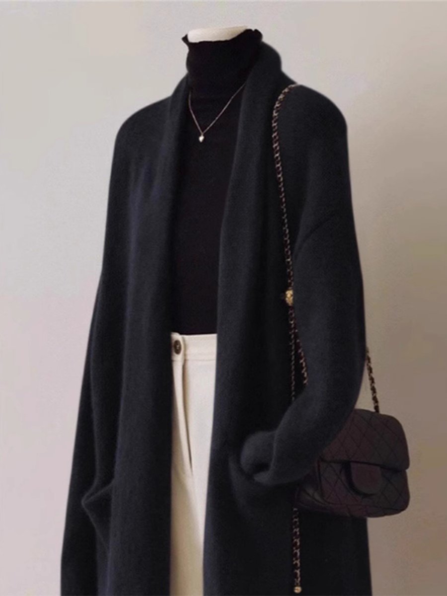 黑色中长款羊绒毛衣外套女秋冬宽松慵懒风遮屁股外穿羊毛针织开衫