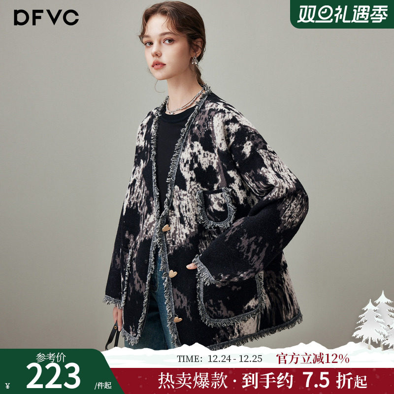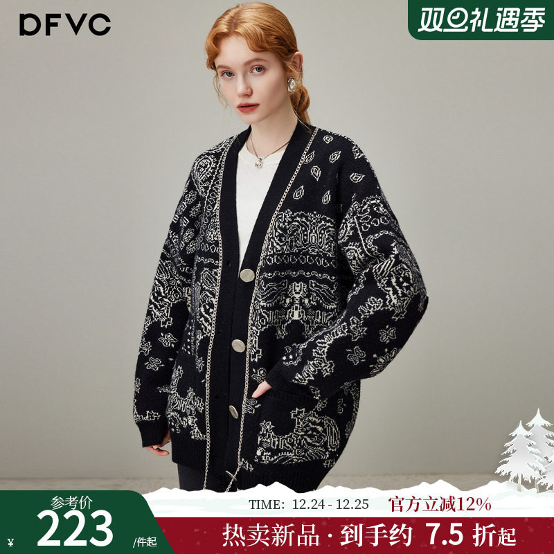 dfvc黑色慵懒风提花针织开衫女2025年冬季新款宽松中长款毛衣外套