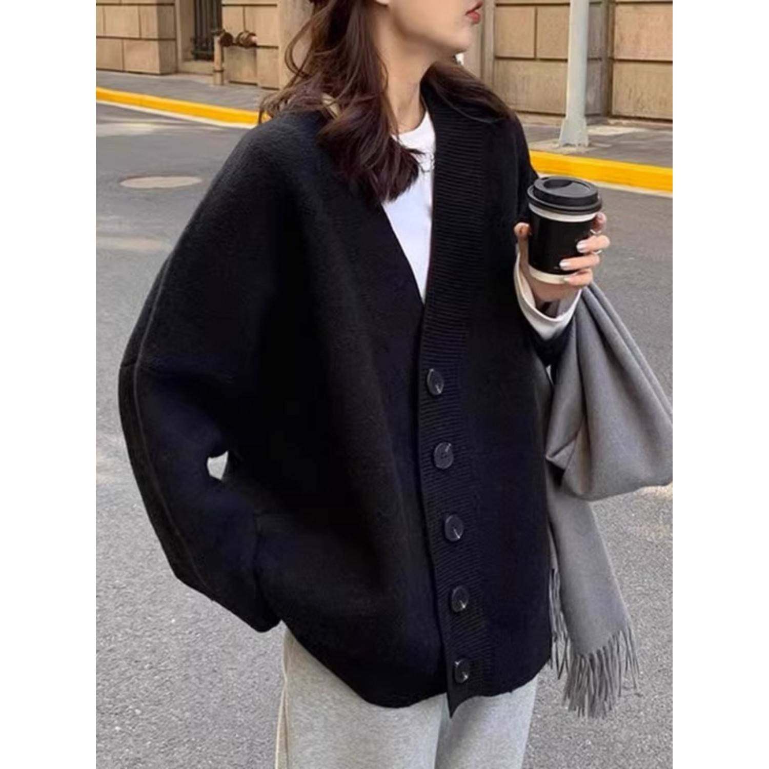 加厚版!慵懒风黑色单排扣毛衣开衫女冬季新款宽松中长款针织外套