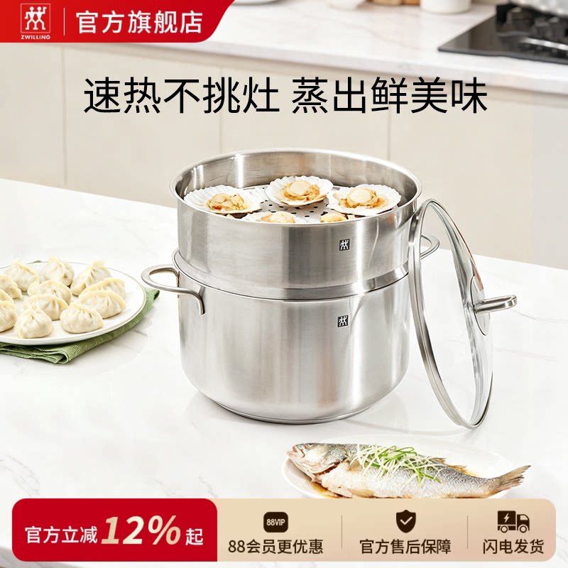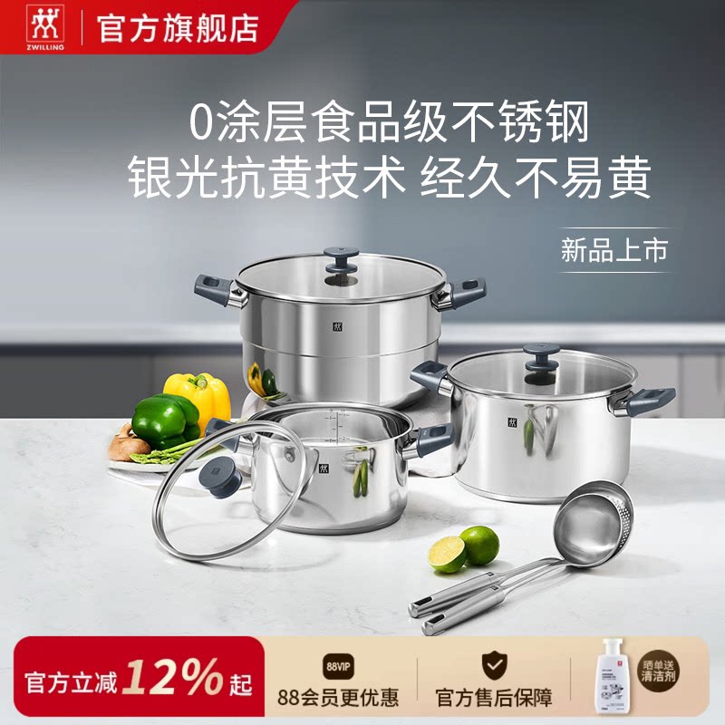 德国双立人0涂层不锈钢奶锅炖锅蒸锅含蒸格Silver银光系抗黄外壁