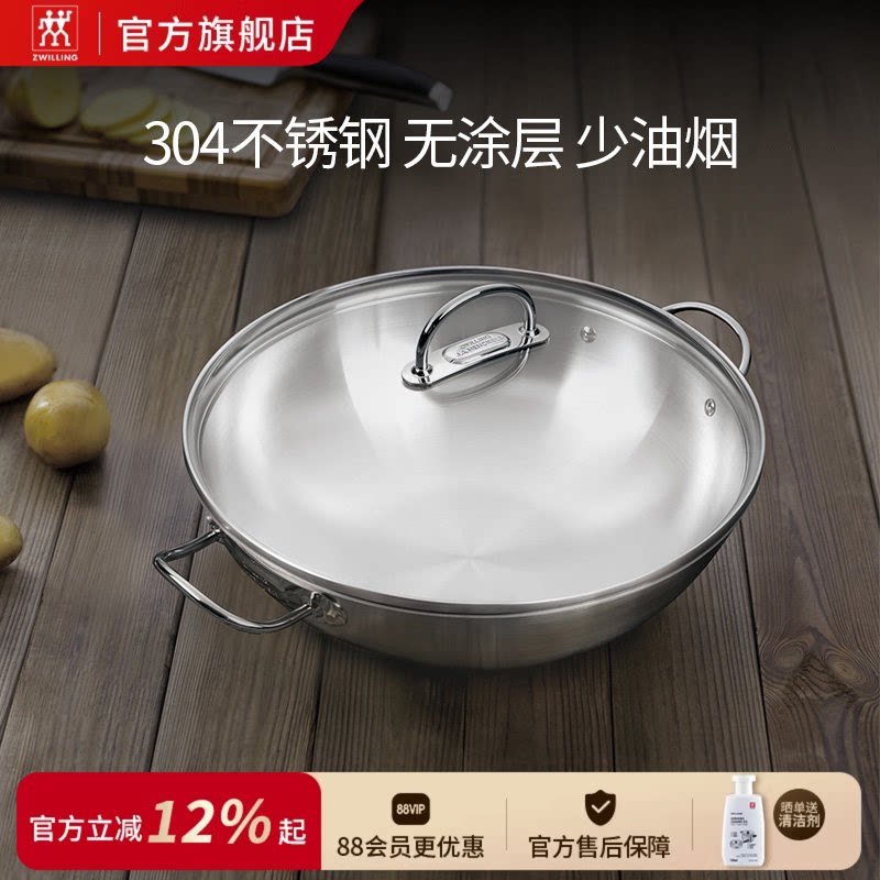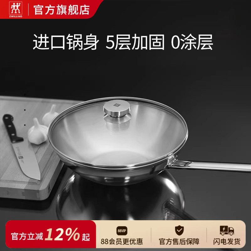 德国双立人Prime炒锅无涂层锅不锈钢中式炒锅0涂层炒锅厨房专用