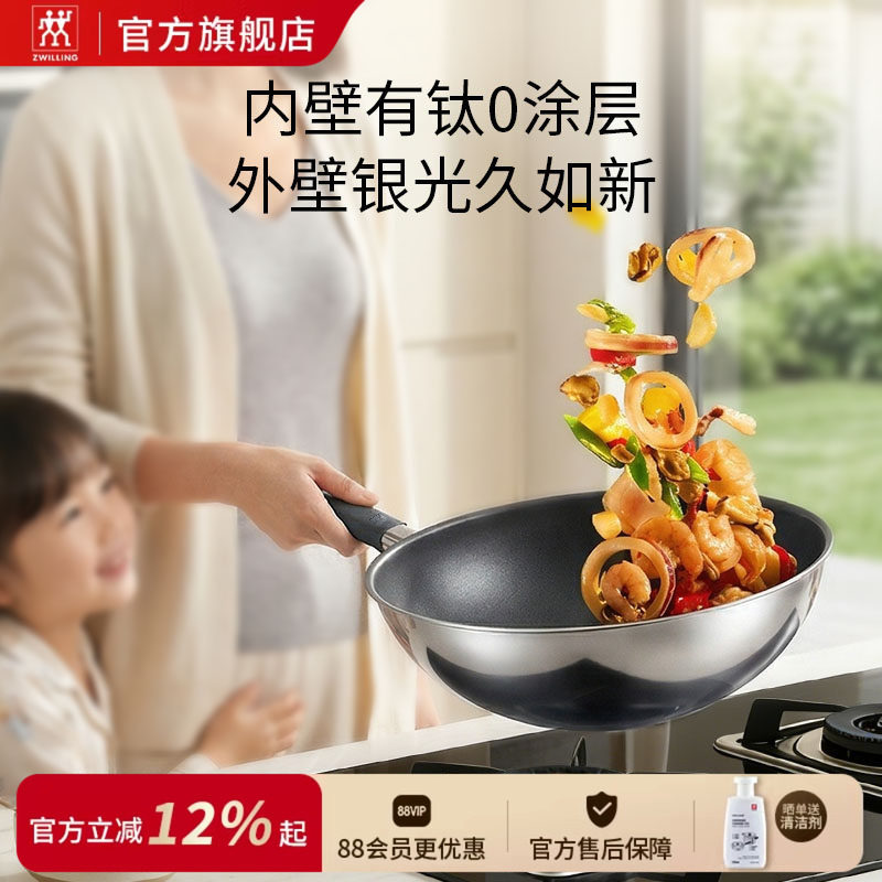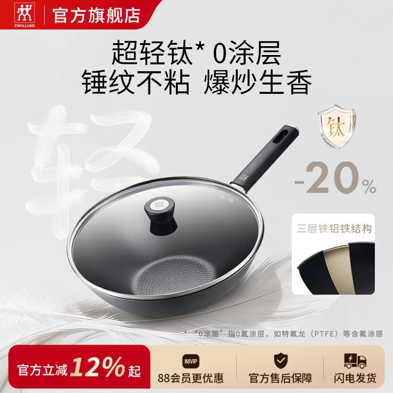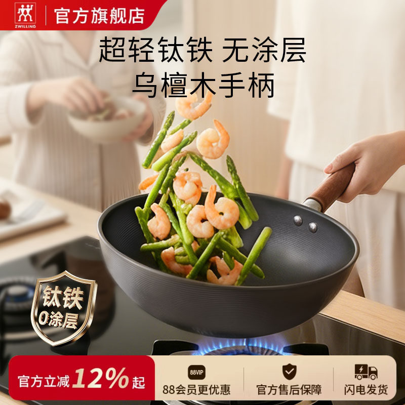 德国双立人纯钛炒锅0涂层家用量轻不粘锅电磁炉炒菜锅SilverTi II