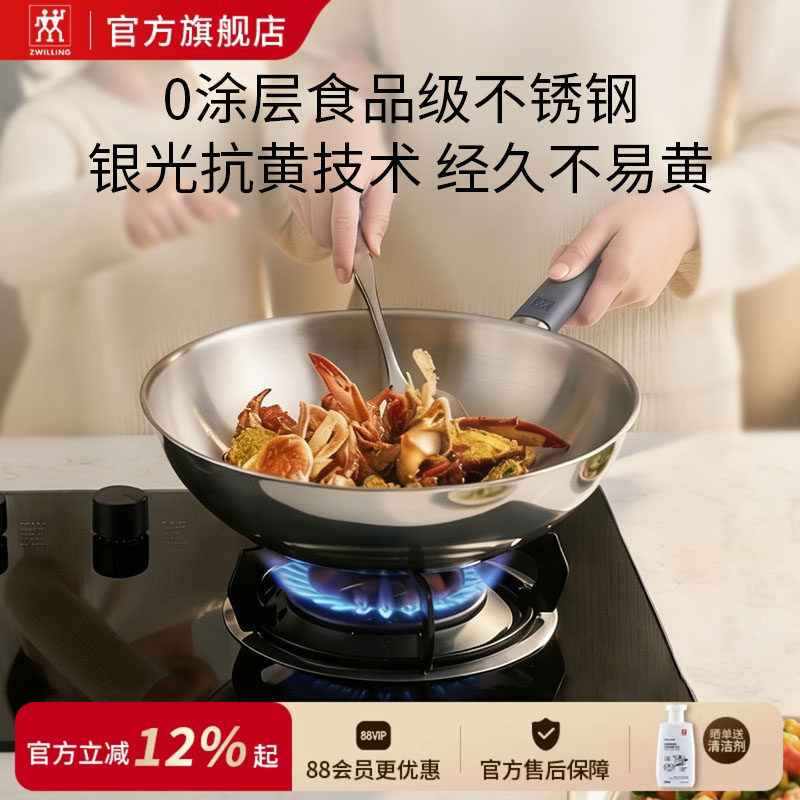 德国双立人0涂层不锈钢炒锅家用炒菜少油烟Silver银光电磁炉适用