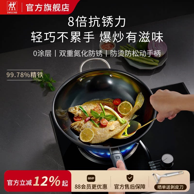 德国双立人中式炒锅超轻钛铁锅0涂层无油烟中式炒锅Silver系列