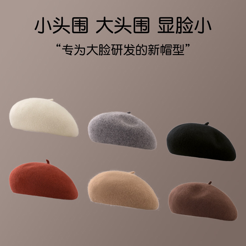 小头围羊毛贝雷帽女秋冬白色画家帽毛呢大头围显脸小红色洋气黑色