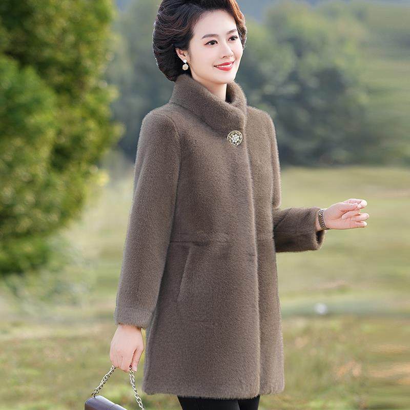中年妈妈冬装外套新款皮毛一体大衣中老年女装加绒加厚中长款皮草