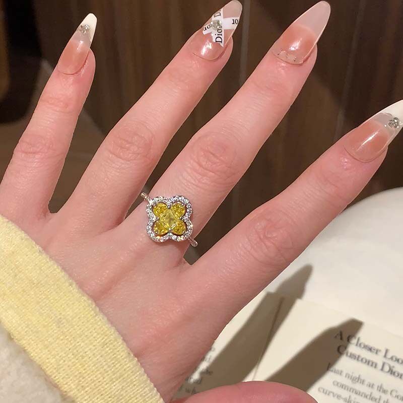 清新优雅~黄钻四叶草戒指女轻奢高级感开口尾戒素圈戒指女食指环