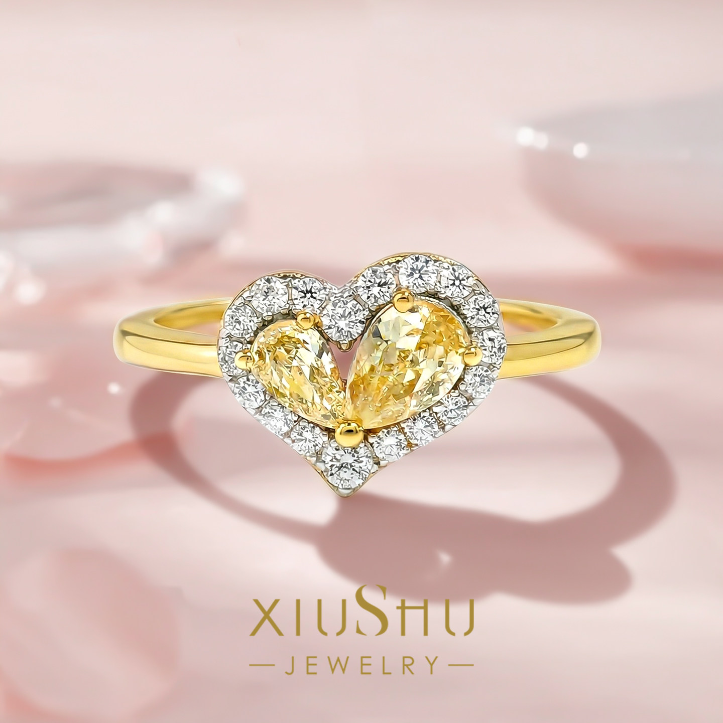 精工版星芒心钻双石爱心黄钻色925银戒指甜美可爱小众设计感温柔