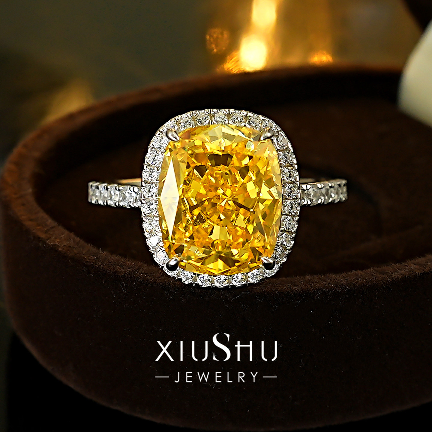 5克拉浓彩黄钻色925纯银戒指女雷迪恩碎冰肥方长满钻彩钻小富婆款