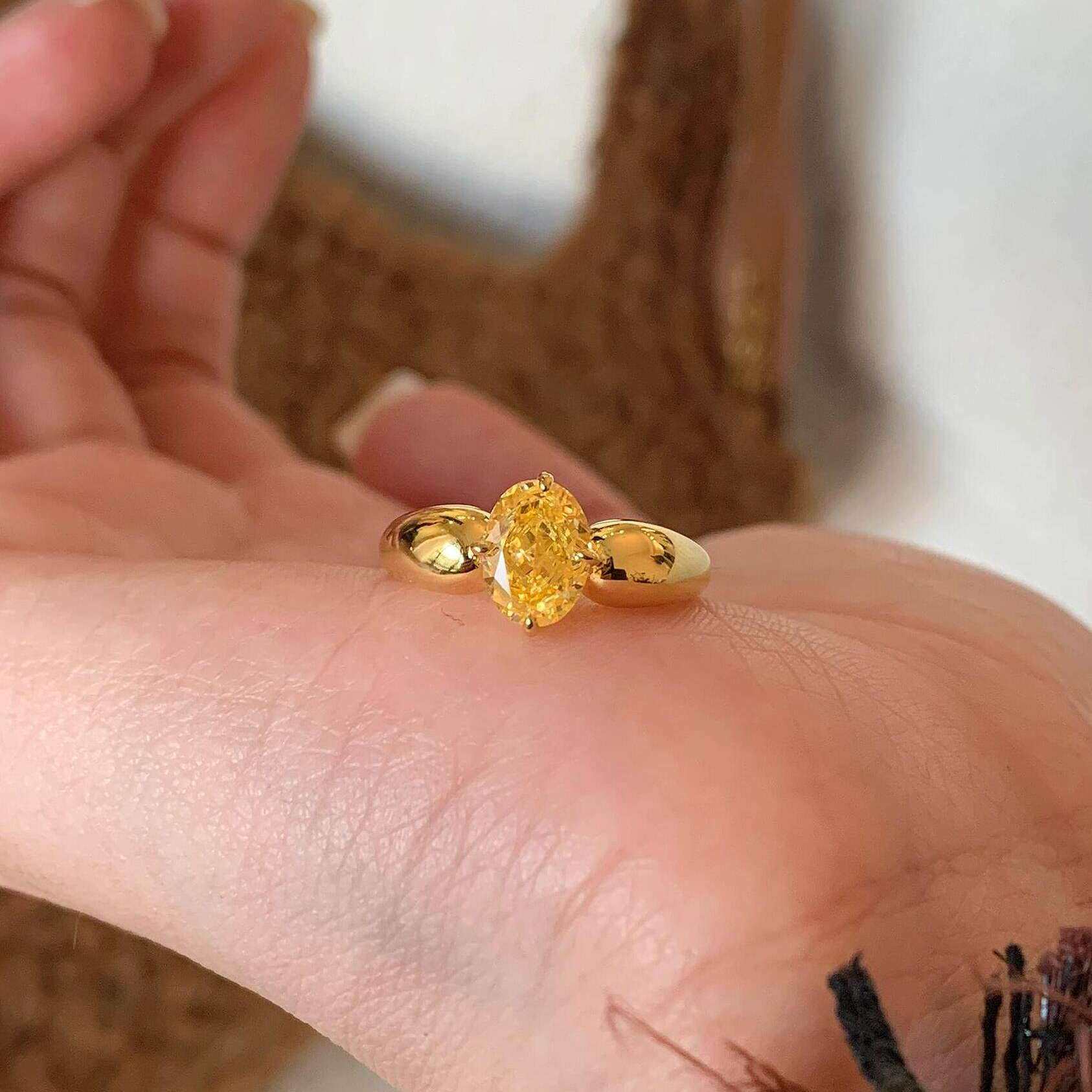 定制款轻奢拉丝宽臂浓彩黄钻色戒指雷迪恩切割椭圆高碳钻指环食指