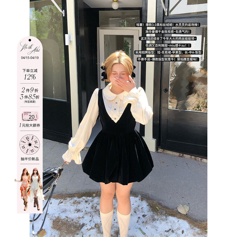 安妮不火 甜美丝绒连衣裙女2025秋冬新款微胖大码显瘦气质花苞裙
